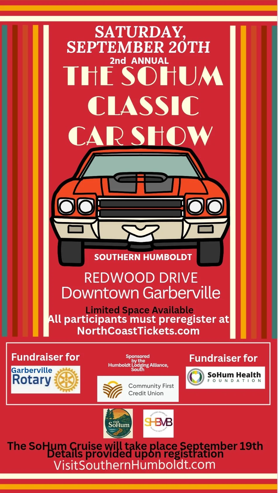 Calling all classic car enthusiasts! Join us for an unforgettable experience at the Annual SOHUM Classic Car Show & Cruise. See rare, iconic and exciting vehicles from decades past take center stage. This event is a celebration of automotive heritage and a benefit fundraiser for the Garberville Theater Project.